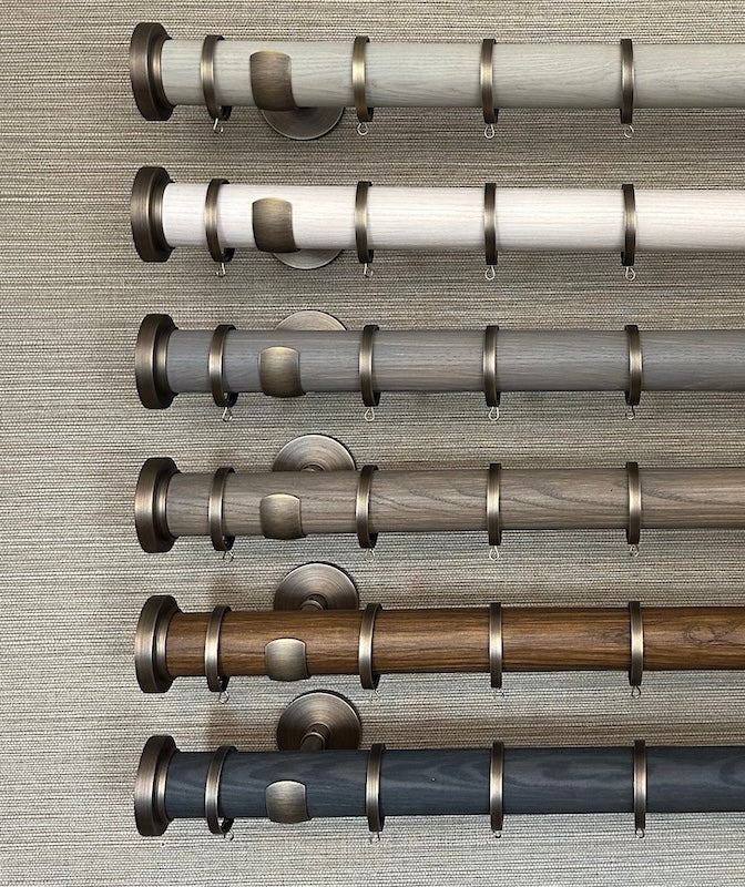 A timeless yet contemporary collection featuring 50mm stained Ash curtain poles, paired with antique brass finials, rings, and brackets. This range blends classic craftsmanship with a modern aesthetic, perfect for understated luxury interiors.