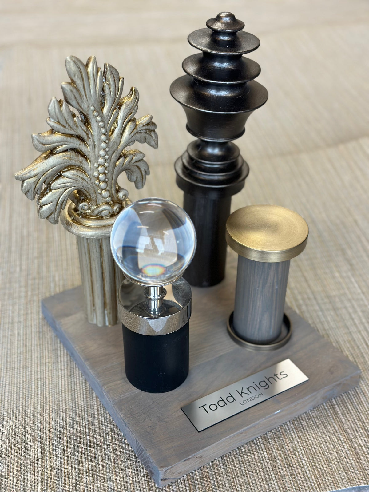 At Todd Knights, we offer curated finial display sets exclusively for our trade customers — an ideal way to showcase the quality, craftsmanship, and finish options of our bespoke curtain poles to your clients.